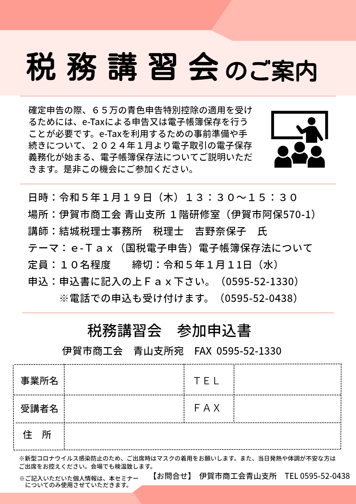 税務講習会のご案内 令和5年1月19日 2022/12/15 税務講習会のご案内日時:令和5年1月19日(木) 13:30~15:30場所:伊賀市商工会 青山支所 1階研修室(伊賀市阿保570-1)講師:結城税理士事務所 税理士 吉野奈保子 氏テーマ:e-Tax(国税電子申告)電子帳簿保存法について定員:10名程度 締切:令和5年1月11日(水)申込:申込書に記入の上、Fax下さい。 (0595-52-1330) *電話での申込も受付致します。 (0595-52-0438)申込書はこちらをご参照お願い致します→ご参照ファイル